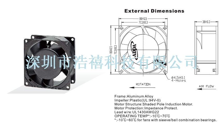 | Fan = AC- FAN | Size = 80x80x38 | Speed = | Flow = | Noise = |