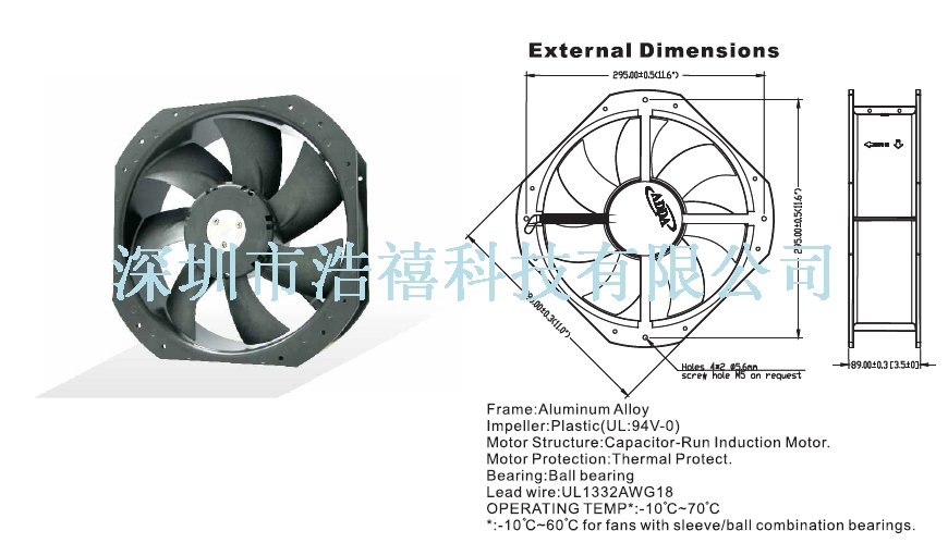 | Frame Size | Model No | Bearing | Volt. (VAC) | Current (A) | Speed (rpm) | Air Flow (CFM) | Pressure (InAq) | Noise (dB/A) | |